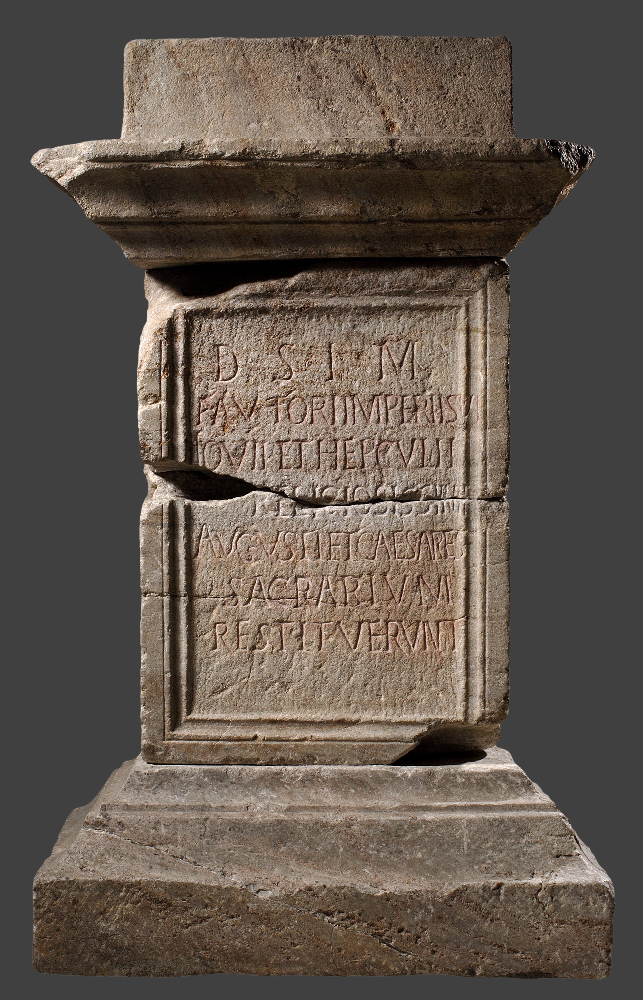 D(eo) S(oli) I(nvicto) M(ithrae) / FAVTORI IMPERII SVI / IOVII ET HERCVLII / RELIGIOSISSIMI / AVGVSTI ET CAESARES / SACRARIVM / RESTITVERVNT