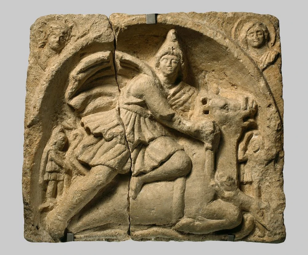 Zentrum des Mithraskults war die Tauroktonie – die Darstellung der Stiertötung: Mithras, mit Mantel und phrygischer Mütze bekleidet, kniet auf einem niedergeworfenen Stier, hält ihn an den Nüstern und stößt ihm ein Schwert in die Schulter. Um ihn gruppieren sich stets dieselben Begleiter – Hund, Schlange, Skorpion, Rabe – sowie Getreideähren, die aus dem Schweif des Tieres sprießen. Was wie ein Opferritual wirkt, ist ein vielschichtiges Symbolsystem. Als Mysterienreligion war der Mithraskult nur Eingeweihten zugänglich; seine Inhalte blieben durch Schweigegelübde geschützt. Frauen war der Zutritt verwehrt, viele Aspekte des Kultes bleiben bis heute im Dunkeln.