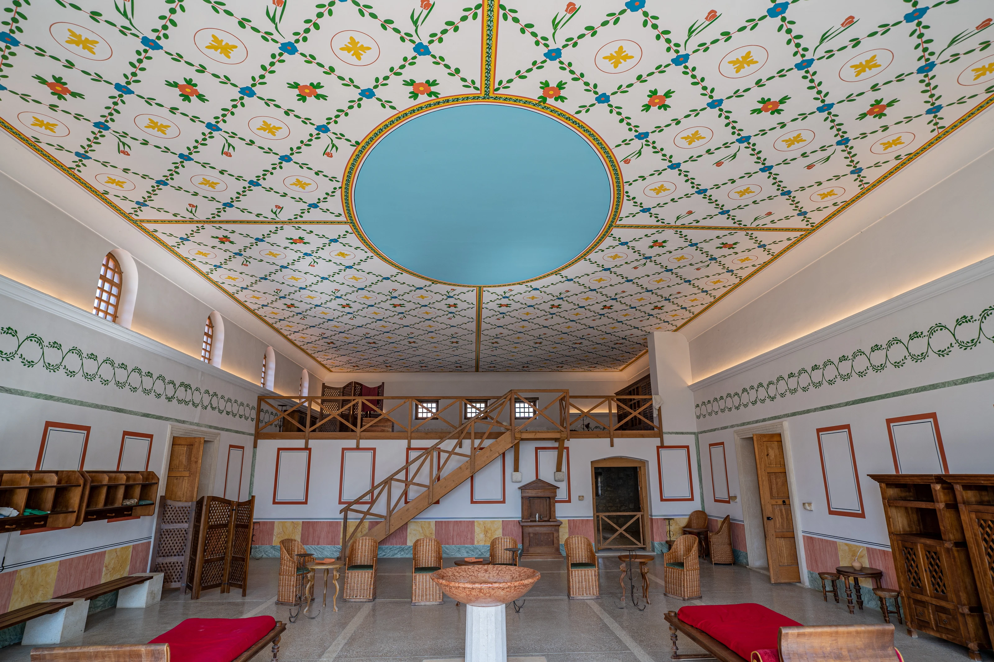 The magnificent ceiling paintings in the reconstructed hall of the Roman baths