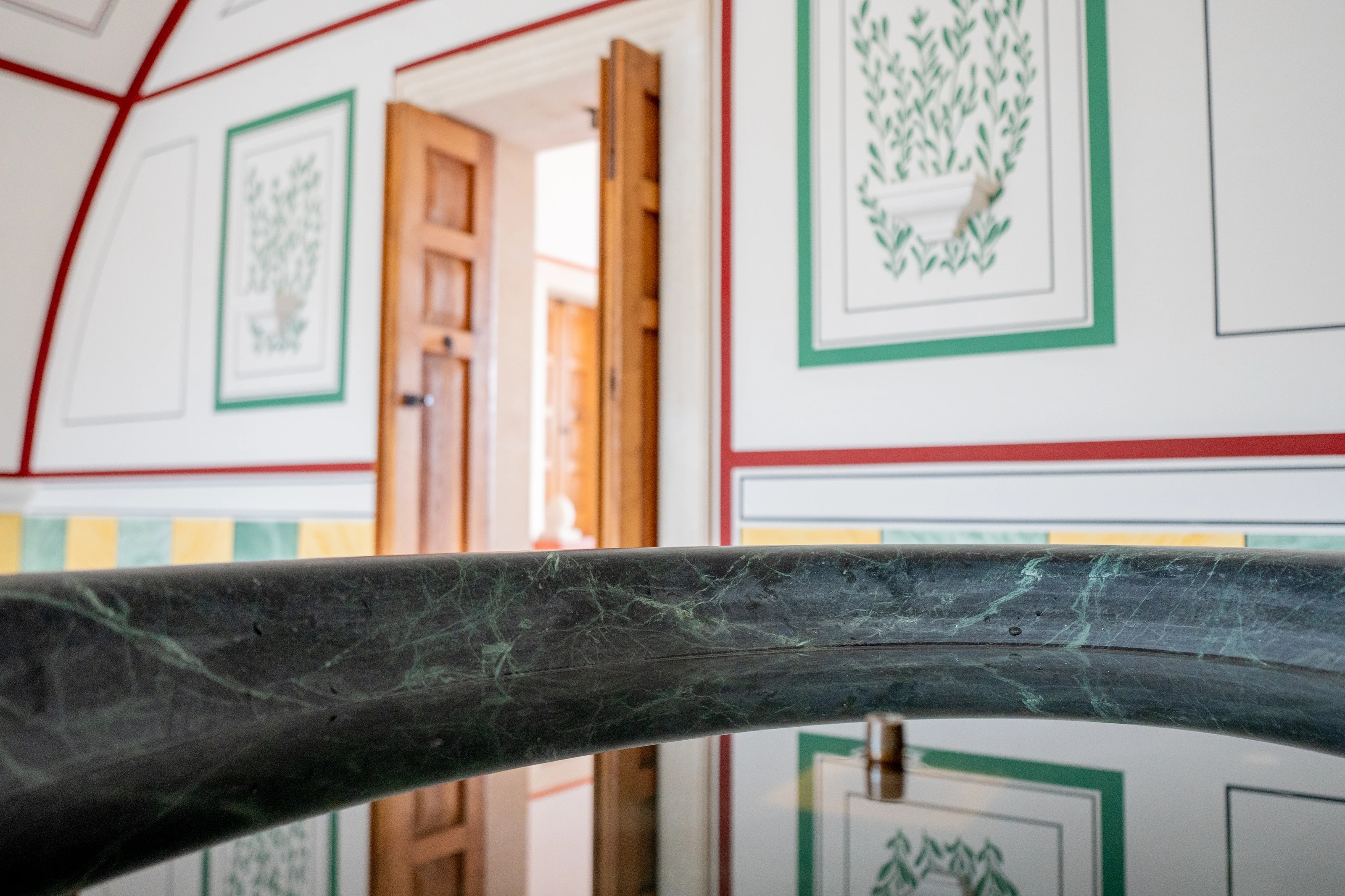 Painting was by no means a given, especially in thermal baths. Heat, humidity, and steam took a heavy toll on painted surfaces. For this reason, builders often preferred to use more durable materials such as mosaics or marble cladding. This makes the preserved ceiling painting from the now-reconstructed thermal baths in the Roman Quarter all the more remarkable. It depicts a regular pattern of green leaf stems forming a lattice-like system. Flowers or fruits appear in the spaces between them. The decoration appears both orderly and lively. It structures the surface without seeming rigid, combining ornamental clarity with botanical abundance.